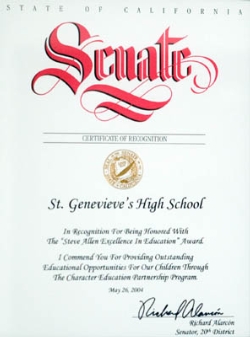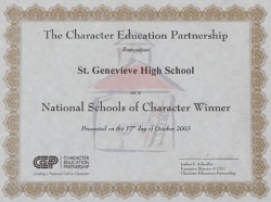 In October 2003, St. Genevieve was the first high school in California - and the first Catholic school in the nation - to be named a "National School of Character" by the Character Education Partnership in Washington, D.C. Faculty and staff flew to the nation's capitol to accept the prestigious honor on behalf of the entire school community.